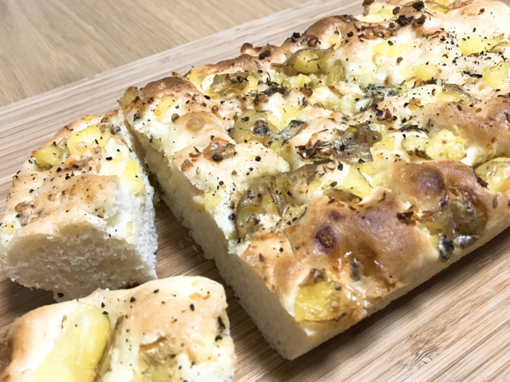 1回目に作ったものは、フレッシュバジルとチェリートマトのフォカッチャ。2回目はタイムとブルーチーズ、ジャガイモのフォカッチャ。エキストラバージンオリーブオイルをかけて焼き上げると、ハーブ香るおいしいフォカッチャができました。次はオリーブを使って、次はカラメライズドオニオンを使って、とバリエーションプランは広がります。